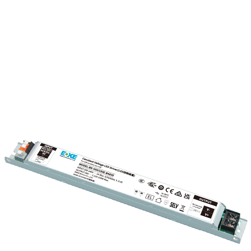 输出无频闪、待机功耗 < 0.5W、高功率因数、高效率、低谐波、中央应急(直流输入下 100% 输出)、独立式应急、多重保护(输出短路保护 / 输出过载保护)标准认证类:ErP 能效认证、SELV、Class I、恒压线条灯、恒压灯带、落地灯、三防灯、支架灯